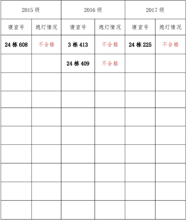 为改正各种不良现象和陋习,增强宿舍学习氛围,营造温馨家园氛围,伟德victor1946官网登录团委员工会生活权益服务部对三个年级所有寝室进行熄灯检查。本次熄灯情况通报不合格寝室4间,具体情况如下: