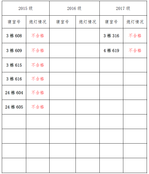 为改正各种不良现象和陋习,增强宿舍学习氛围,营造温馨家园氛围,伟德victor1946官网登录团委员工会生活权益服务部对三个年级所有寝室进行熄灯检查。本次熄灯情况通报不合格寝室8间,具体情况如下: