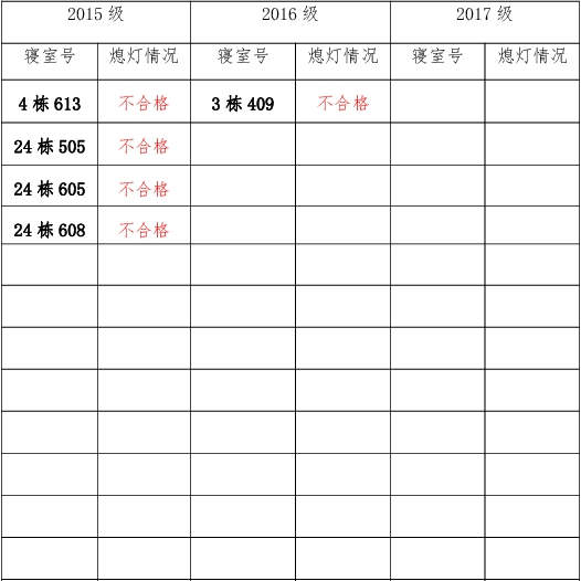 为改正各种不良现象和陋习,增强宿舍学习氛围,营造温馨家园氛围,伟德victor1946官网登录团委员工会生活权益服务部对三个年级所有寝室进行熄灯检查。本次熄灯情况通报不合格寝室5间,具体情况如下: