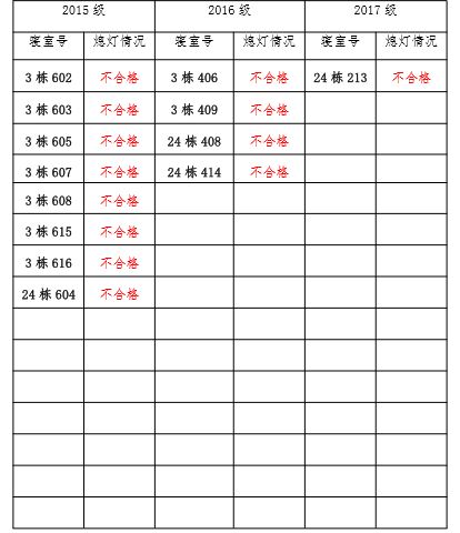 为改正各种不良现象和陋习,增强宿舍学习氛围,营造温馨家园 氛围,伟德victor1946官网登录团委员工会生活权益服务部对三个年级所有寝室进行熄灯检查。本次熄灯情况通报不合格寝室 13 间,具体情况如下: