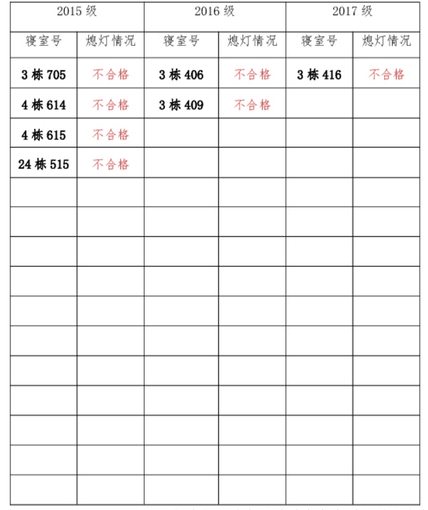 为改正各种不良现象和陋习,增强宿舍学习氛围,营造温馨家园氛围,伟德victor1946官网登录团委员工会生活权益服务部对三个年级所有寝室进行熄灯检查。本次熄灯情况通报不合格寝室7间,具体情况如下: