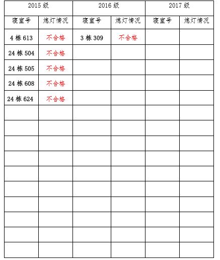 为改正各种不良现象和陋习,增强宿舍学习氛围,营造温馨家园氛围,伟德victor1946官网登录团委员工会生活权益服务部对三个年级所有寝室进行熄灯检查。本次熄灯情况通报不合格寝室 6 间,具体情况如下:
