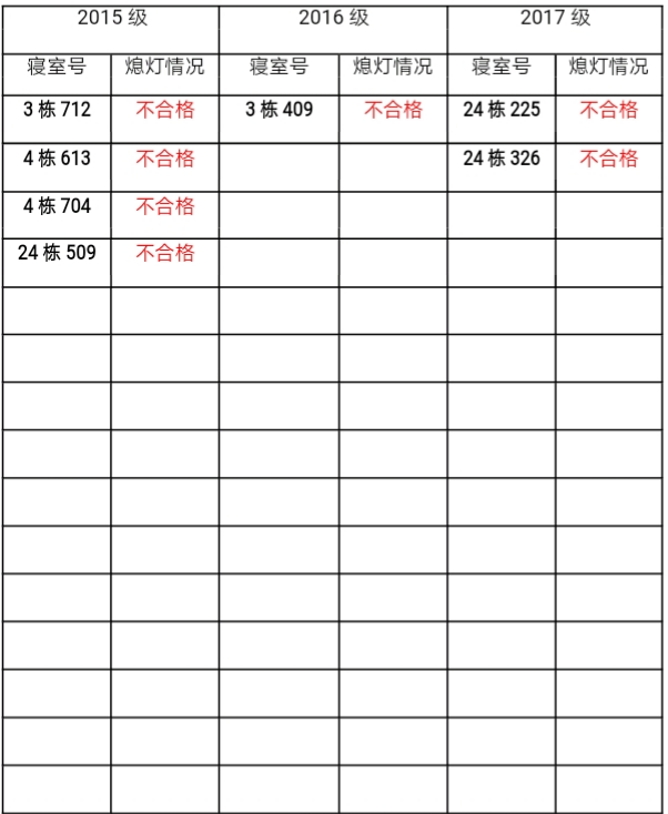 为改正各种不良现象和陋习,增强宿舍学习氛围,营造温馨家园氛围,伟德victor1946官网登录团委员工会生活权益服务部对三个年级所有寝室进行熄灯检查。本次熄灯情况通报不合格寝室 7 间,具体情况如下: