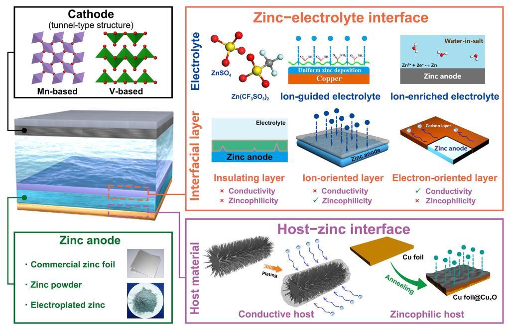(水系锌离子电池结构与负极界面设计方法示意图)
