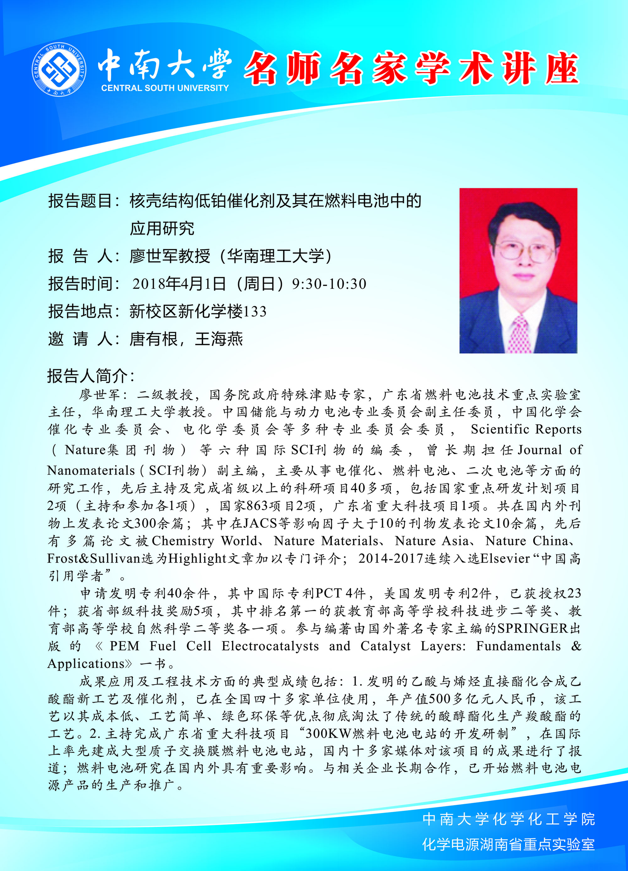 2018年4月1日 廖世军教授 《核壳结构低铂催化剂及其在燃料电池中的应用研究》报告