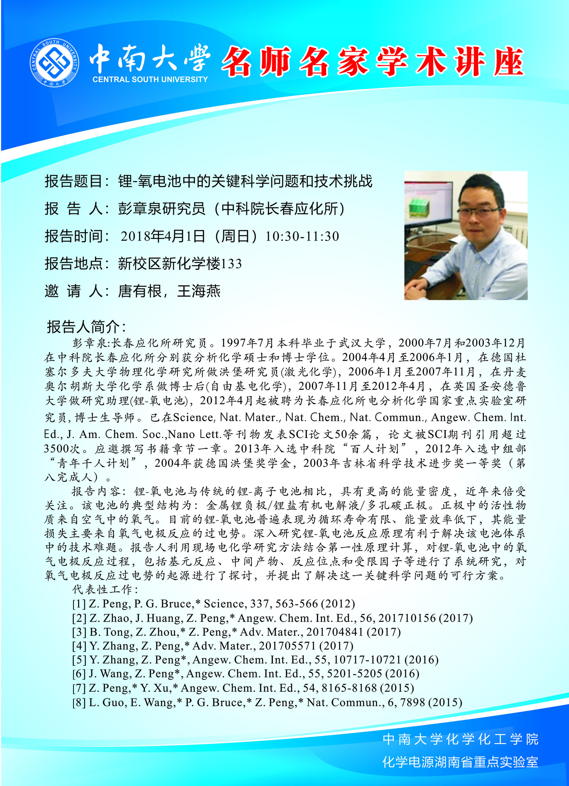 2018年4月1日 彭章泉研究员 《锂-氧电池中的关键科学问题和技术挑战》报告