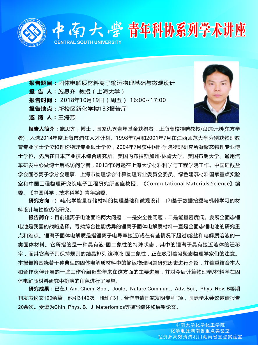 2018年10月19日 施思齐教授 《固体电解质材料离子输运物理基础与微观设计》报告