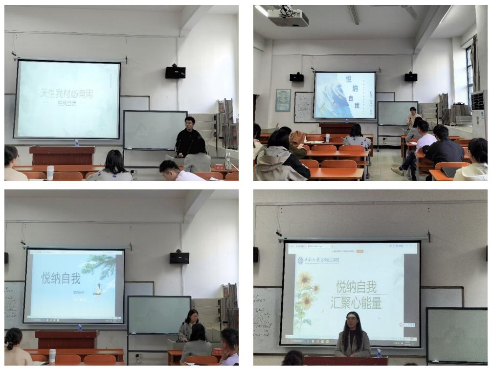 首先,2022级硕士5班心理委员车宇航以“天生我材必有用”为题分享了如何悦纳自我,在改正不足时也要接受自我;2022级硕士6班心理委员李丽珍围绕“自爱、自信、自强”三个方面展开,结合典型案例和“伤疤实验”深入剖析,提出了一些更好悦纳自我的小建议;心助会活动部部长许芊芊以多个真实案例为切入点,强调了悦纳自我的必要性,呼吁大家积极肯定自己,努力成为更优秀的自己。