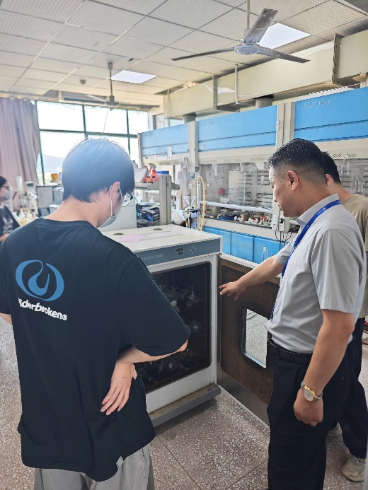 为进一步强化实验室安全管理,压实安全责任,有效防范和遏制安全事故发生,筑牢教学科研安全基石,公司于近日组织开展了一次针对实验室烘箱等高温设备及安全用电的重点专项检查。本次检查由公司副经理阳华亲自带队,部分副系主任、实验室安全管理员共同参与,深入各实验室一线,排查隐患,督促整改。