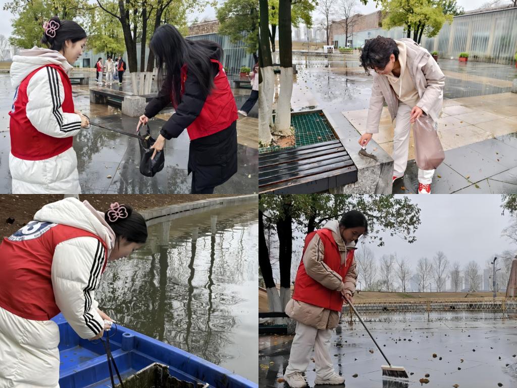 活动伊始,团支部在洋湖湿地公园科普馆内集合。在班委的安排下,同学们分成若干小组,手持扫帚、垃圾袋、夹子等清洁工具,迅速投入到洋湖湿地公园的环境清理工作中。