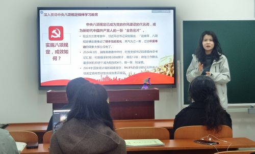 团课伊始,肖茜斤用一段简洁的视频阐释了中央八项规定和中央八项规定精神的背景和区别。随后,她带领大家学习中央政治局八项规定的内容,指出中央八项规定已成为党的作风建设的代名词,成为新时代中国共产党人的一张“金色名片”。